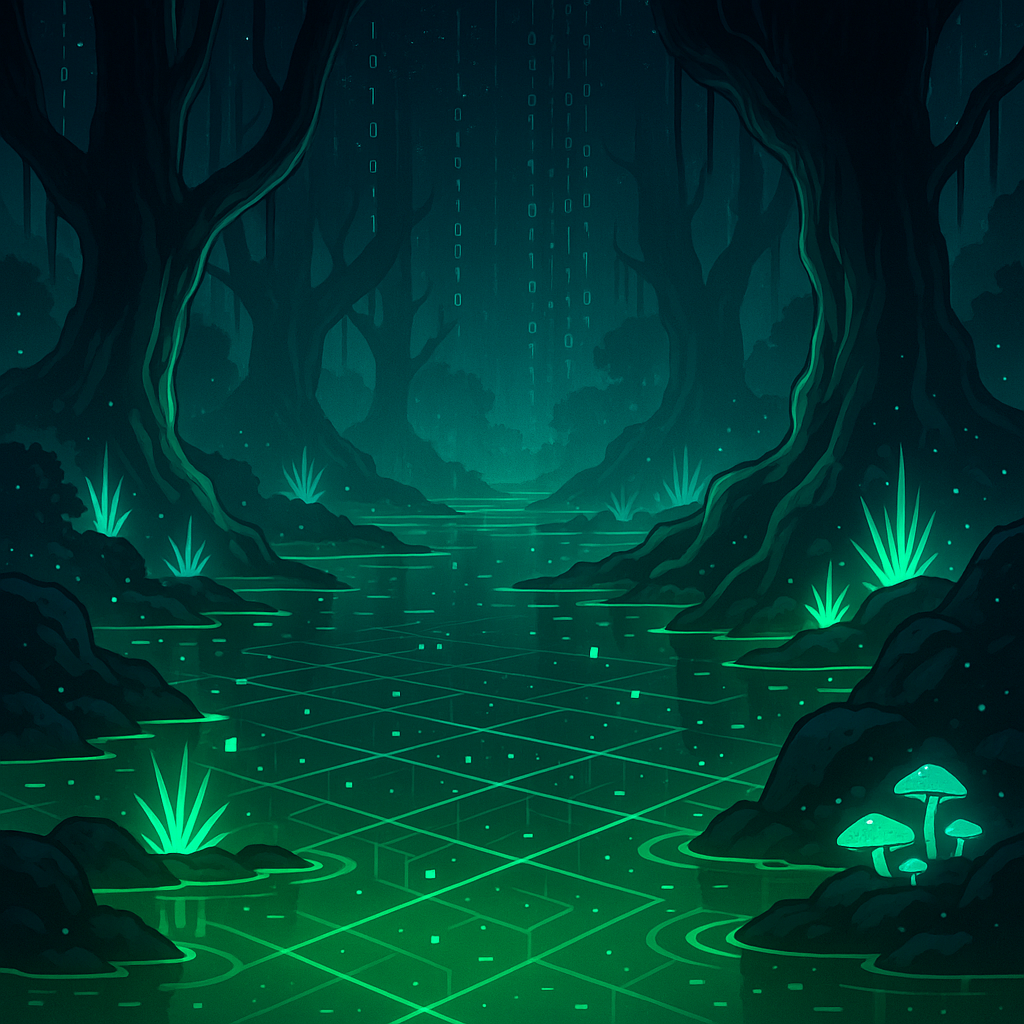 A sprawling neon marsh where data flows like liquid through glowing reeds. Fog carries fragments of corrupted code, and debug-bugs blink erratically, feeding on system errors.