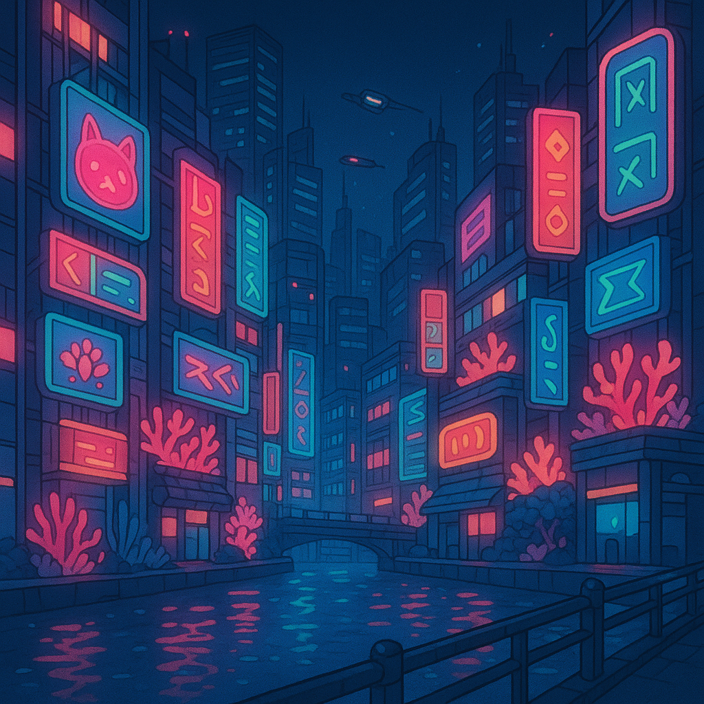 The capital of the Habitat — a neon dystopia filled with surveillance fish-bots, propaganda screens, and towering wet-tech structures.